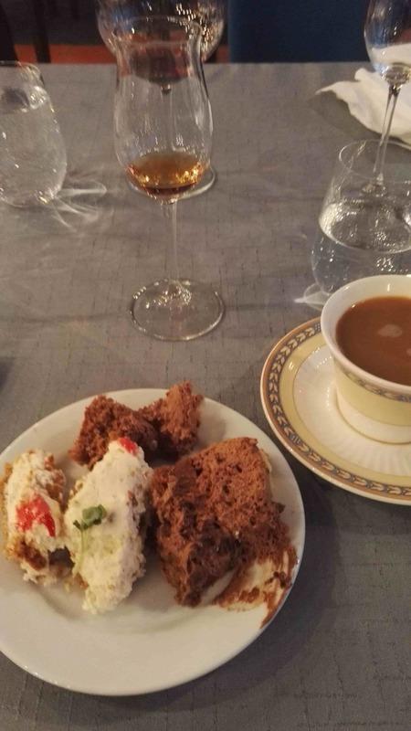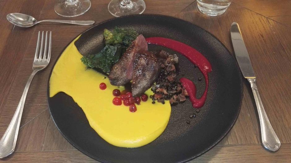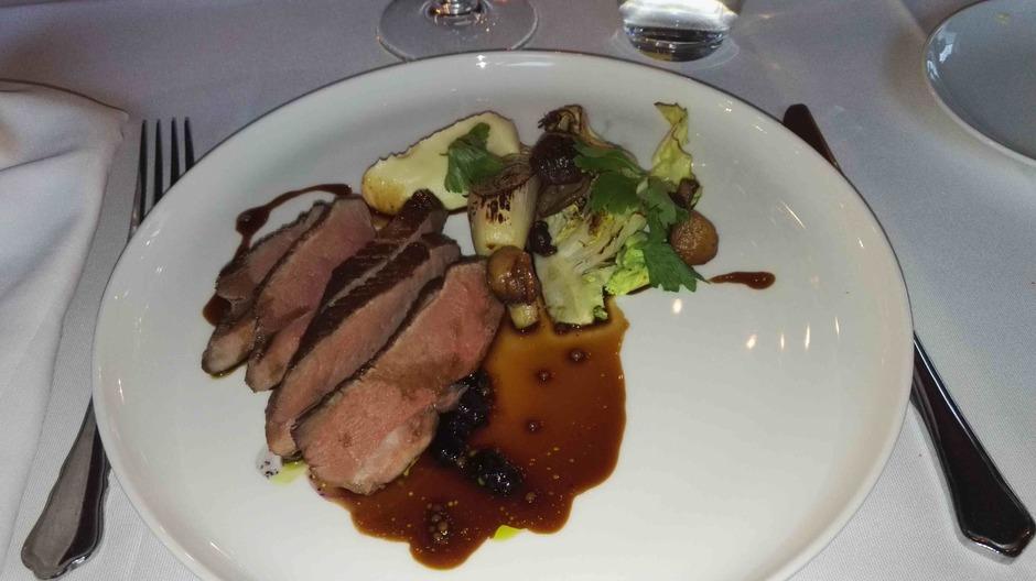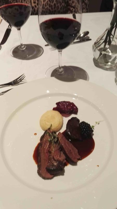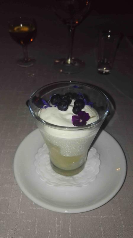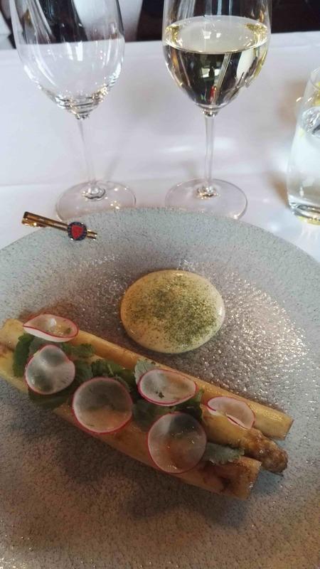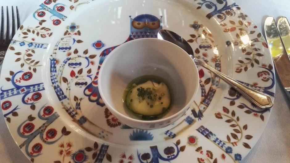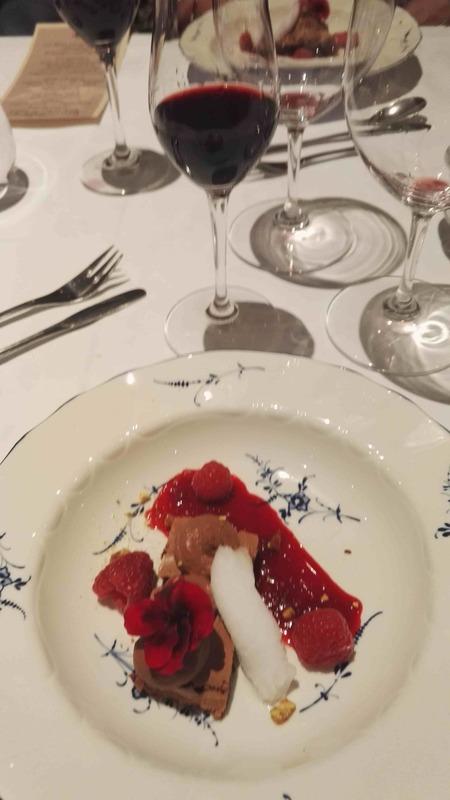 Yllätysmenun (kirjallisena emme sitä nähneet) avasi kolmen suupalan keittiön tervehdys elsassilaisen gramonan kanssa. Alkuruokana oli ankanmaksapyréetä ja leipää miedon punaviinin kyydittämänä. Pääruoalle oli katettu haarukan ja veitsen kanssa myös lusikka. Se olikin tarpeen, sillä paistettu turska ja karhunlaukka oli saanut seurakseen yrttisen (mm. vihreä curry) kastikkeen, joka olisi ollut sääli jättää lautaselle. Täyteläinen valkoviini pääsikin kastikkeen kanssa oikeuksiinsa. Ennen jälkiruokaa saimme tyrni- ja ruusuvaahtokarkkeja sekä macaron-leivoksia. Varsinaisessa jälkiruoassa oli valkosuklaata, vispipuuroa ja maitojäätelöä eteläafrikkalaisen jälkiruokaviinin kera.