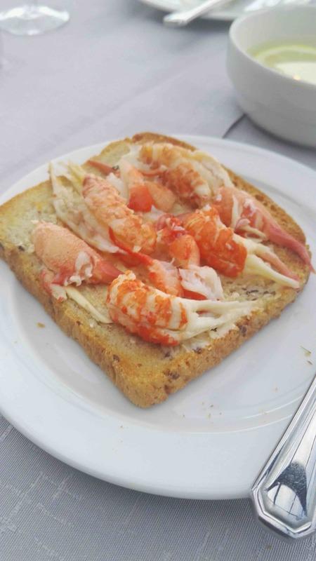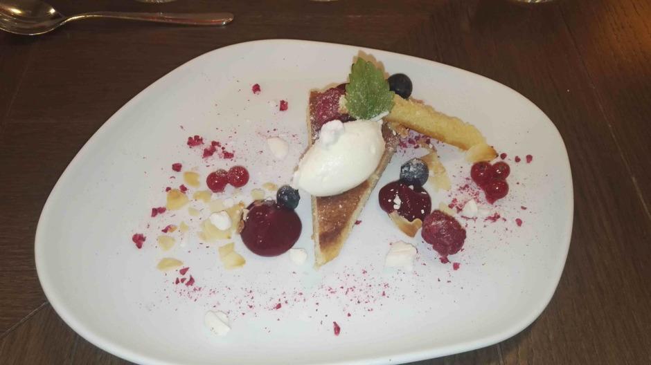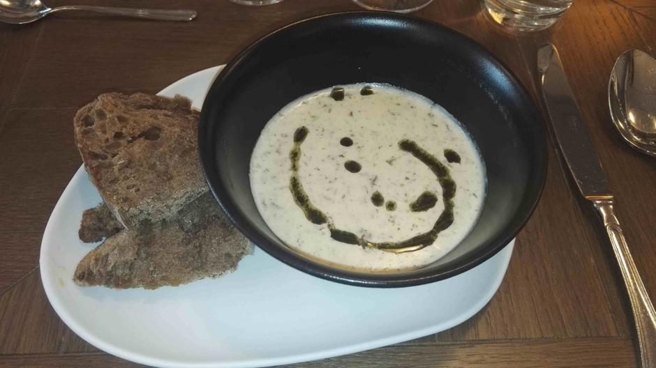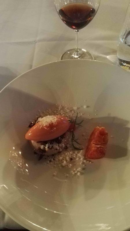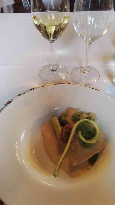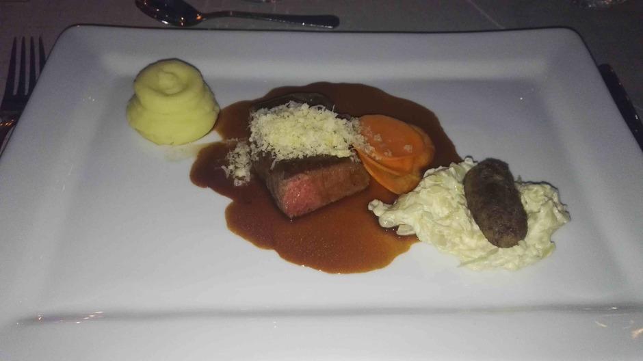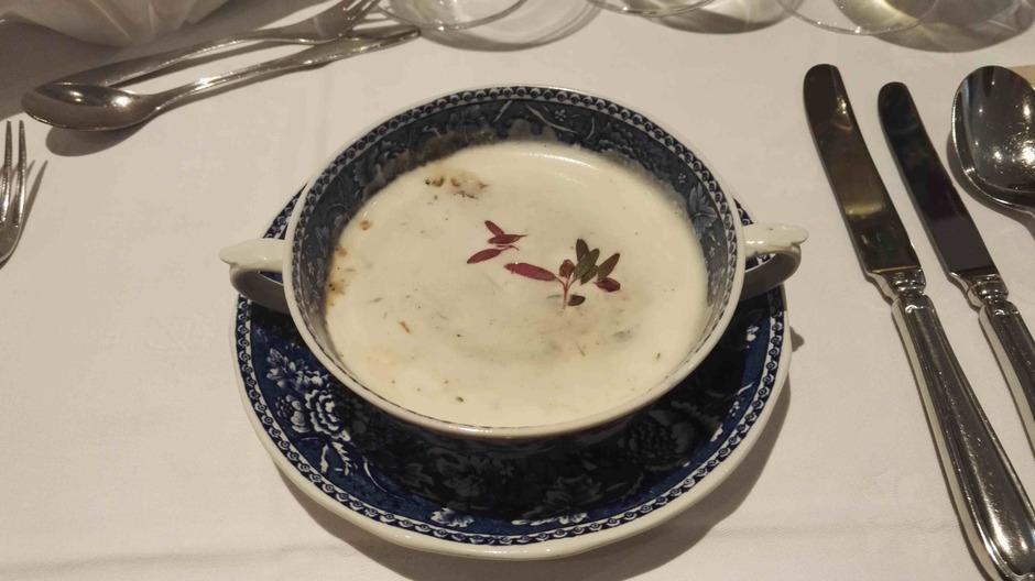 Yllätysmenun (kirjallisena emme sitä nähneet) avasi kolmen suupalan keittiön tervehdys elsassilaisen gramonan kanssa. Alkuruokana oli ankanmaksapyréetä ja leipää miedon punaviinin kyydittämänä. Pääruoalle oli katettu haarukan ja veitsen kanssa myös lusikka. Se olikin tarpeen, sillä paistettu turska ja karhunlaukka oli saanut seurakseen yrttisen (mm. vihreä curry) kastikkeen, joka olisi ollut sääli jättää lautaselle. Täyteläinen valkoviini pääsikin kastikkeen kanssa oikeuksiinsa. Ennen jälkiruokaa saimme tyrni- ja ruusuvaahtokarkkeja sekä macaron-leivoksia. Varsinaisessa jälkiruoassa oli valkosuklaata, vispipuuroa ja maitojäätelöä eteläafrikkalaisen jälkiruokaviinin kera.