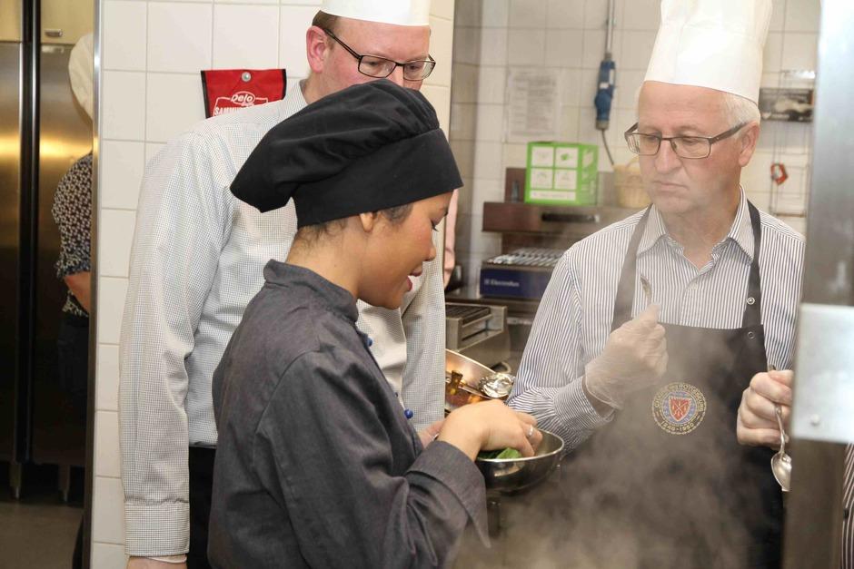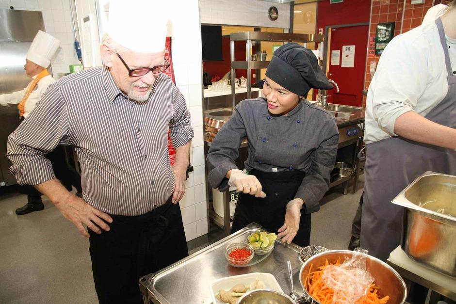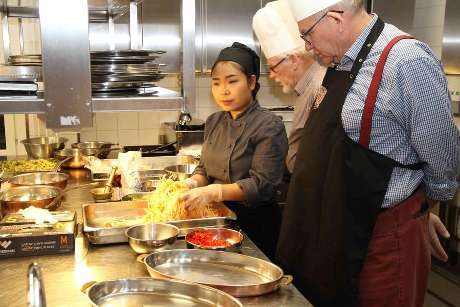 Koulun kaksi thaimaalaista kokkiopiskelijaa olivat opettajien lisäksi kertomassa heidän ruokatottumuksistaan. Nämä kaksi oppilasta olivat myös opastamassa muutaman muun opiskelijan kanssa keittössä ,missä teoriaosuuden jälkeen valmistettiin alkuruokabuffeen ruoat illallista varten. Saimme osallistua eri ruokien tekemiseen . Oppilaat olivat esivalmistelleet osittain raaka-aineet valmiiksi. Näin valmistuivat sitten :