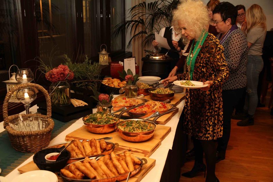 Illalinen klo 18:00 alkaen oli Priimuksen salissa, missä saliopiskelijat olivat valmistelleet kauniin kattauksen. Saliopiskeijat hoitivat juoma- ja ruokatarjoilun, samoin menun ja juomien esittelyn suomeksi ja englanniksi. Alkumaljan nautiskelun lomassa Olli Kokkonen kertoi lyhyesti muutamasta periaatteesta silloin kun itämaiselle ruoalle halutaan juomaksi viiniä. Nyt alkuruokabuffeen kanssa kokeiltiin kahta erilaista valkoviiniä Doctor Loosen Dry Riesling ja Prüm Solitär Riesling. Alkruokabuffee oli herkullinen kokemus.