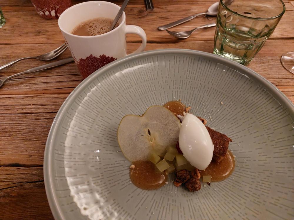 Seuraavan annoksen peura tuli Liedosta. Peuran kaverina lautasella oli sienipyreetä ja madeirakastiketta. Todella maukas annos kruunasi illallisen, jonka päätteeksi nautittiin vielä jälkiruokana spelttiä ja karamellisoitua omenaa.