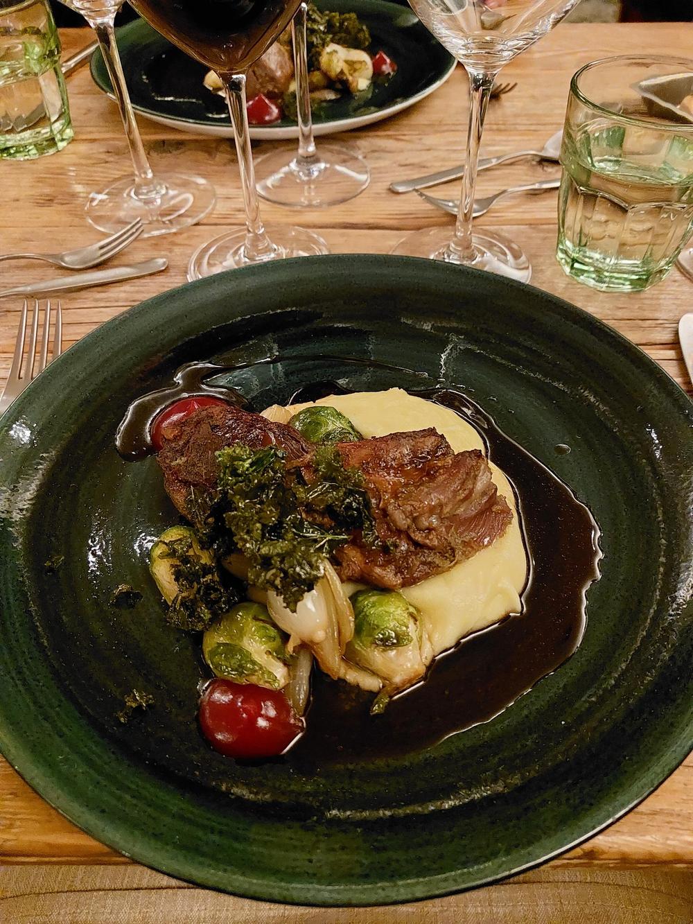 Pääruokana yönyli haudutettua karitsaa, savuperunapyrettä ja karpaloa. Täyteläinen, etelä-rhônelainen Le Petit Baron oli erinomainen valinta viiniksi.