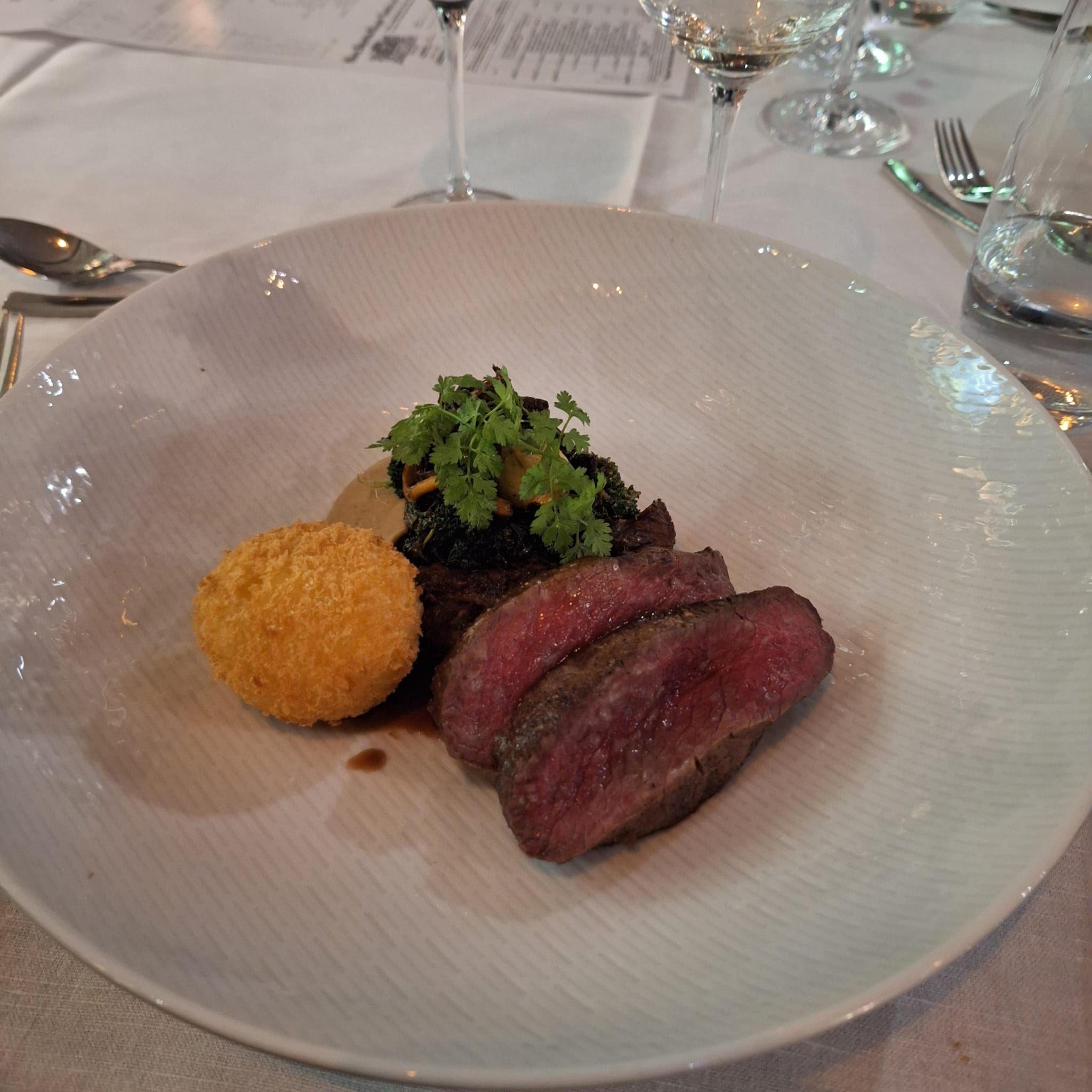 Härän poskea, karamellisoitua sipulipyrettä ja portviinikastiketta