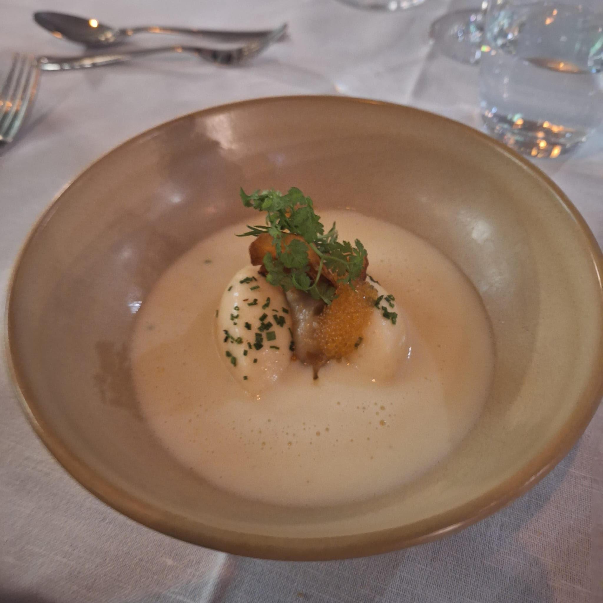 Kampasimpukkakvenelli, miso-maa-artisokkapyreetä, samppanjakastiketta ja XO-kastiketta