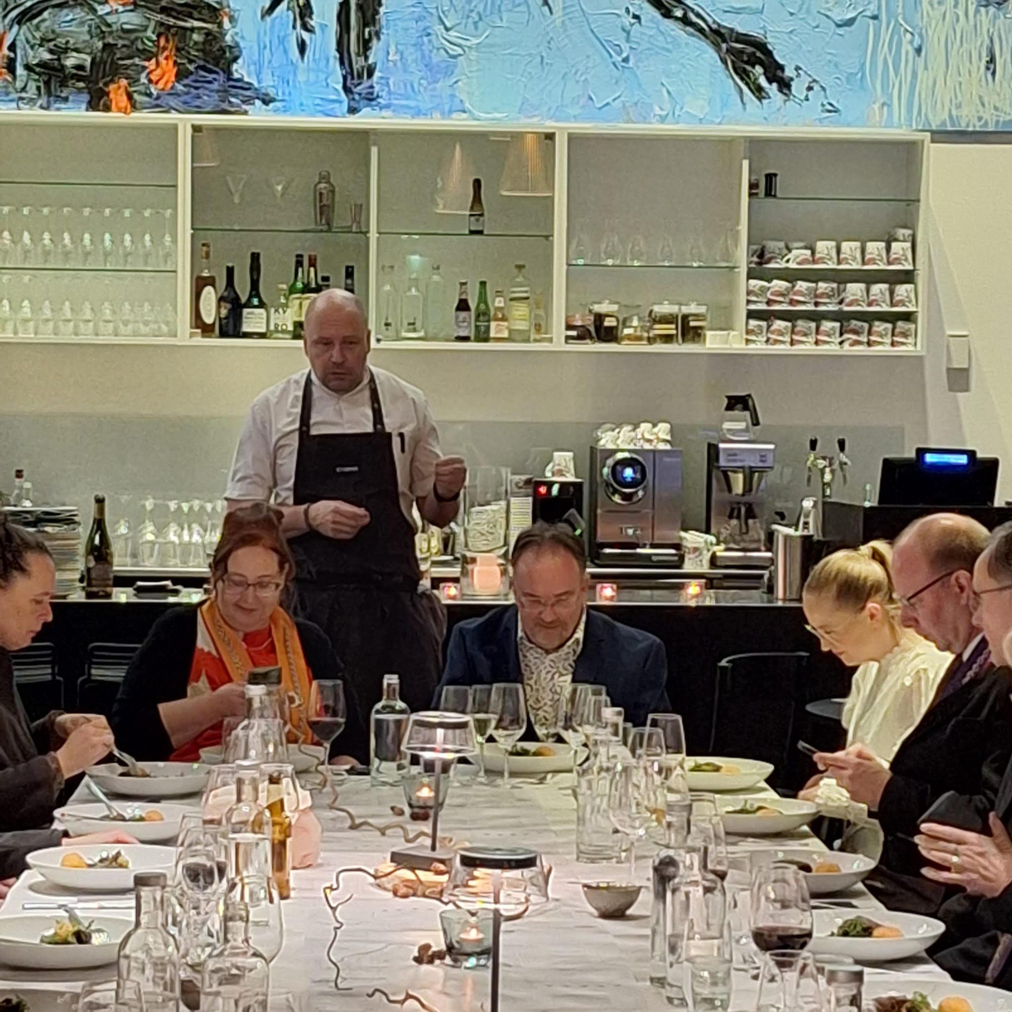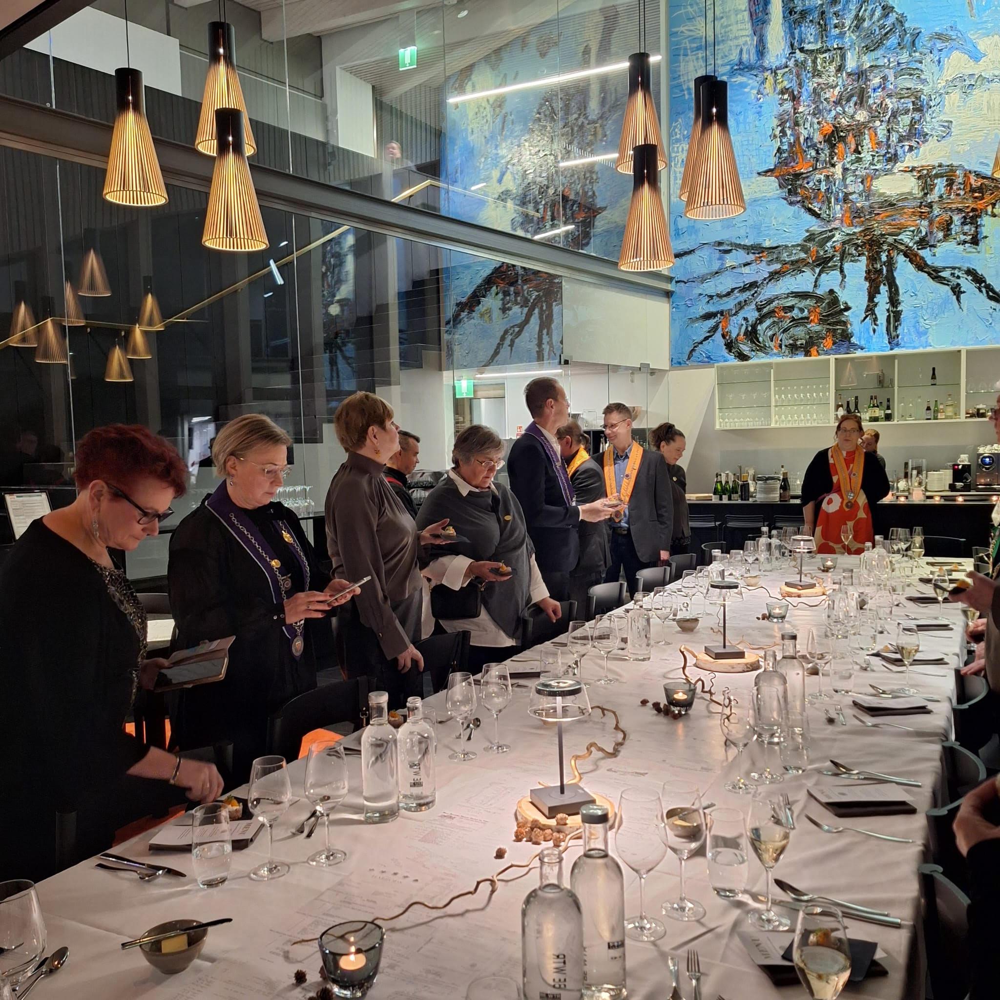 Installoinnin päätyttyä siirryimme Ravintola Isku Centeriin nauttimaan upeasta Grand Dineristä, jonka kokonaisuuden oli suunnitellut Antti Tynkkynen Compass Groupilta. Illan menu oli rakennettu paikallisista raaka-aineista ja Puusta pöytään -teema näkyi vahvasti. Viinit oli valittu tarkasti ruoan makuja täydentämään ja palvelu oli sujuvaa ja huomaamatonta. Iloinen puheensorina täytti salin koko illan ja joskus oli jopa haasteellista saada hiljaisuutta puheita varten.