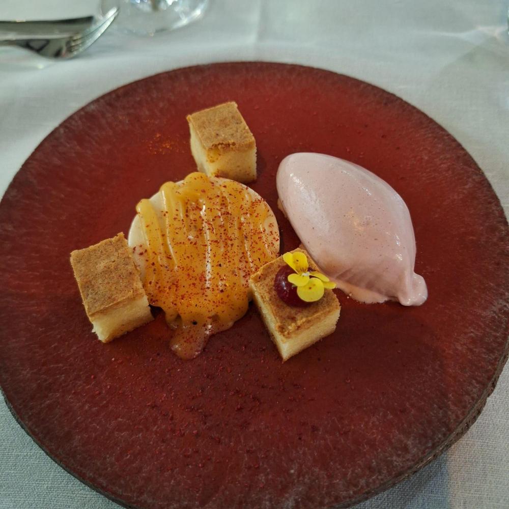 Paistettuja pikkulettuja, kuusenkerkkä-kinuskia, raparperihilloa ja makukermaa