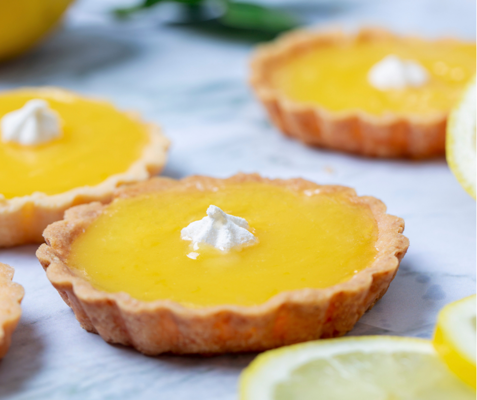 Sitruunacremellä täytetty tartaletti, marenkia ja marinoitua appelsiinia