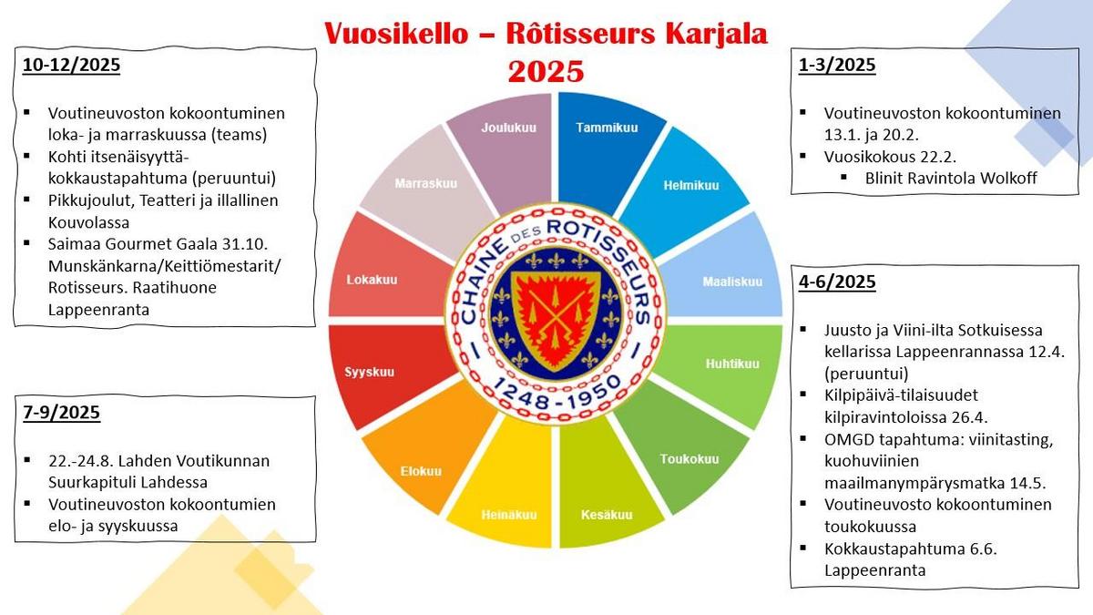 Chaïne des Rötisseurs Karjala ry:n vuosikokous pidettiin 22.2.2025 Wolkoffin viinikellarissa. Vuosikokouksessa valittiin voutikunnalle uusi voutineuvosto. Puheenjohtajana ja voutina jatkaa Ulla Liukkosen. Kokoukseen osallistui 21 hlö.