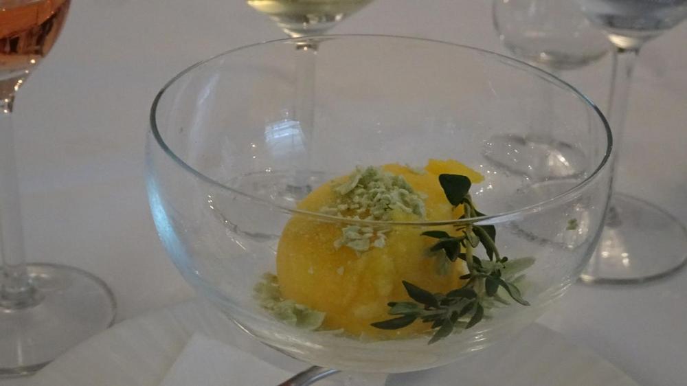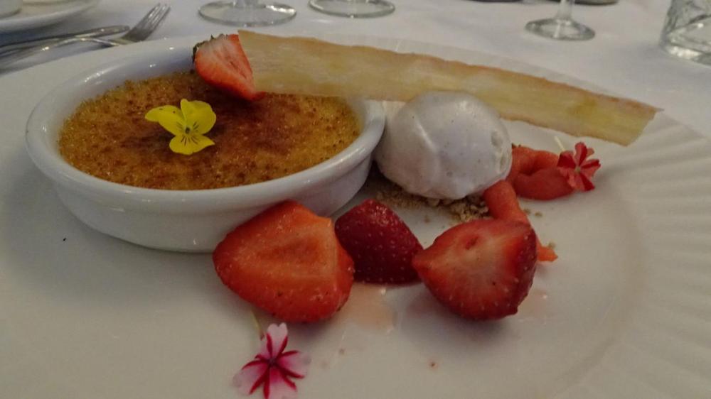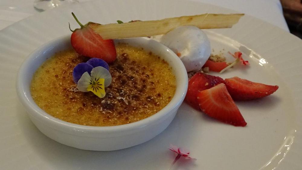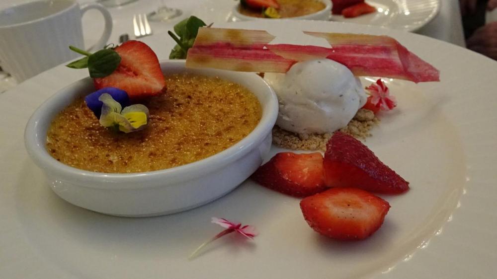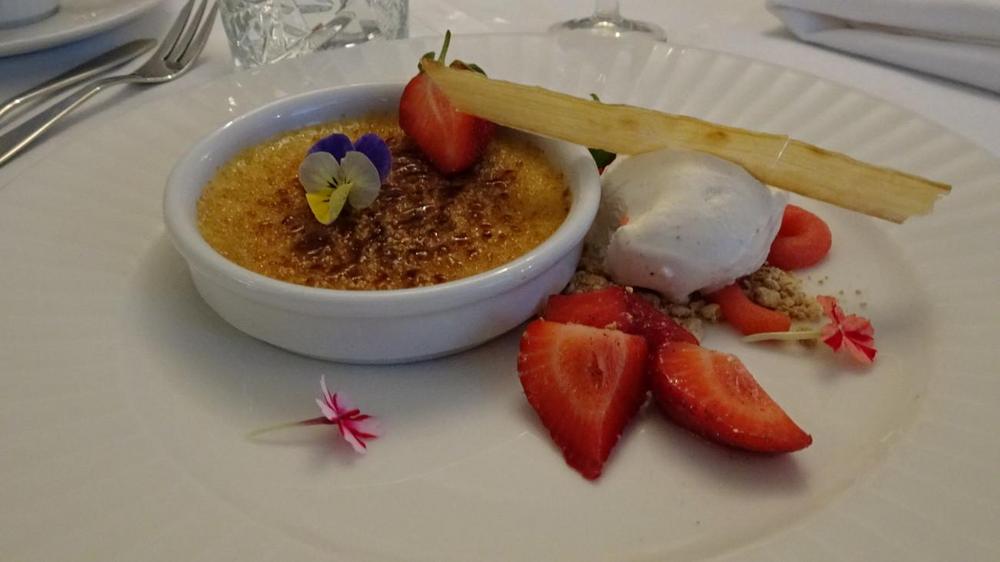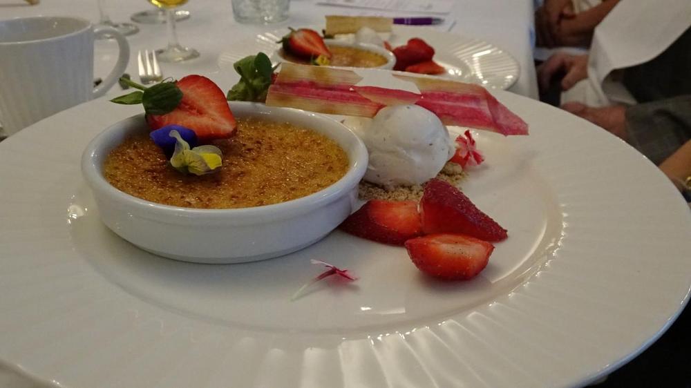 Raparperi Creme Catalana ja mansikkasalaattia, kardemummajäätelöä.