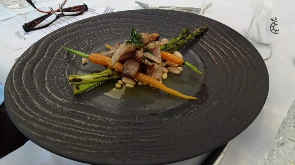 Ibericopossun secretoa, grillattua parsaa, pähkinöitä ja kevätporkkanaa.